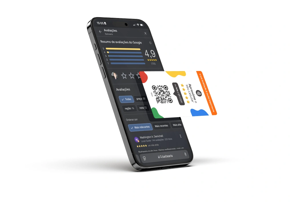 O Cartão de Avaliações do Google possui um QR Code personalizado e tecnologia NFC integrada. Basta o cliente aproximar o celular ou escanear o QR Code para acessar diretamente a página de avaliações da sua empresa no Google.